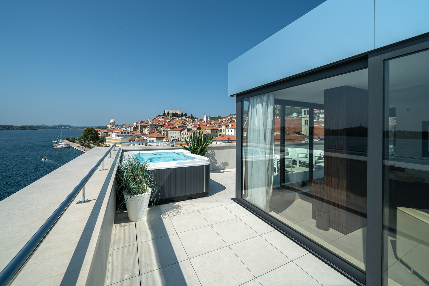 In harmony with being on the highest floor, a premium location, this space was created to be the peak of luxury, and this feeling is brought out through the most comfortable, high quality European furnishings. The view of the channal and old town with the UNESCO protected historical monuments, beautiful harbour and charming sunsets are even better while resting on the terrace with the jacuzzi hot tubs.